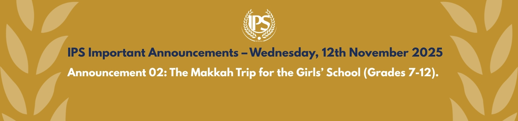 We are pleased to announce a special trip to Makkah for IPS students from Thursday, December 4, 2025 to Saturday, December 6, 2025. This journey offers a unique opportunity for spiritual growth and educational enrichment through performing Umrah and visiting significant Islamic landmarks in the Holy City.